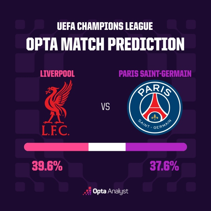 赛前,数据统计机构Opta利用超级计算机对比赛结果进行了模拟预测。结果显示,利物浦在次回合常规时间内取胜的概率为39.6%,但最终能够逆转晋级的概率仅为14.5%。巴黎圣日耳曼常规时间赢球的概率与利物浦相差不大,但由于手握首回合的两球优势,他们晋级的概率高达85.6%。