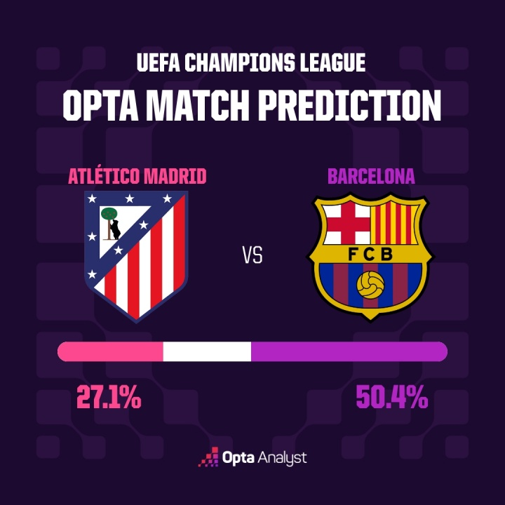 在另一场四分之一决赛中,巴萨客场在90分钟内获胜的概率为50.4%,而马竞的取胜概率则为27.1%。不过就晋级前景而言,马竞被视作绝对的热门,其晋级概率达到79.6%,而巴萨完成翻盘的概率仅为20.4%。